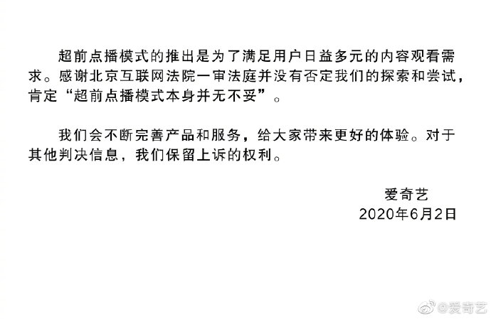 对此,爱奇艺回应称:超前点播模式的推出是为了满足用户日益多元的内容观看需求。感谢北京互联网法院一审法庭并没有否定我们的探索和尝试,肯定“超前点播模式本身并无不妥”。我们会不断完善产品和服务,给大家带来更好的体验。对于其他判决信息,我们保留上诉的权利。
