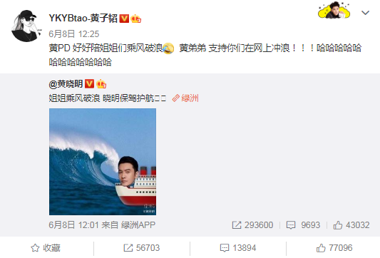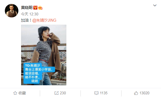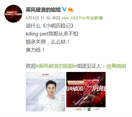 成团见证人黄晓明在节目上线时,按姐姐们姓氏首字母顺序连发30条微博为姐姐们应援,从12点发到12点半。