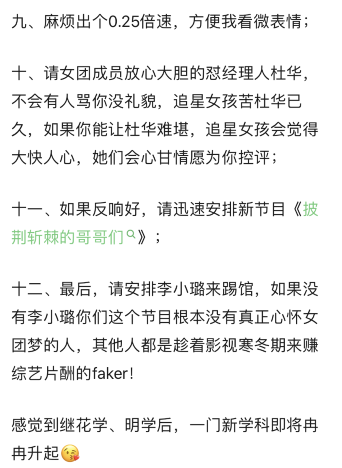 节目组更是大写的求生欲,当备受争议的女团经理人杜华谈女团标准时,将“仅代表杜华女士个人标准”打在屏幕上,盲猜节目组内心os:你爱咋说咋说,与我无瓜。
