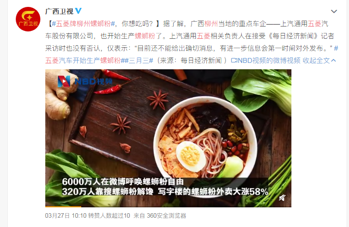 早在今年三月份的时候,网上就出现了爆料,一张由五菱生产的螺蛳粉图片在网上不胫而走。