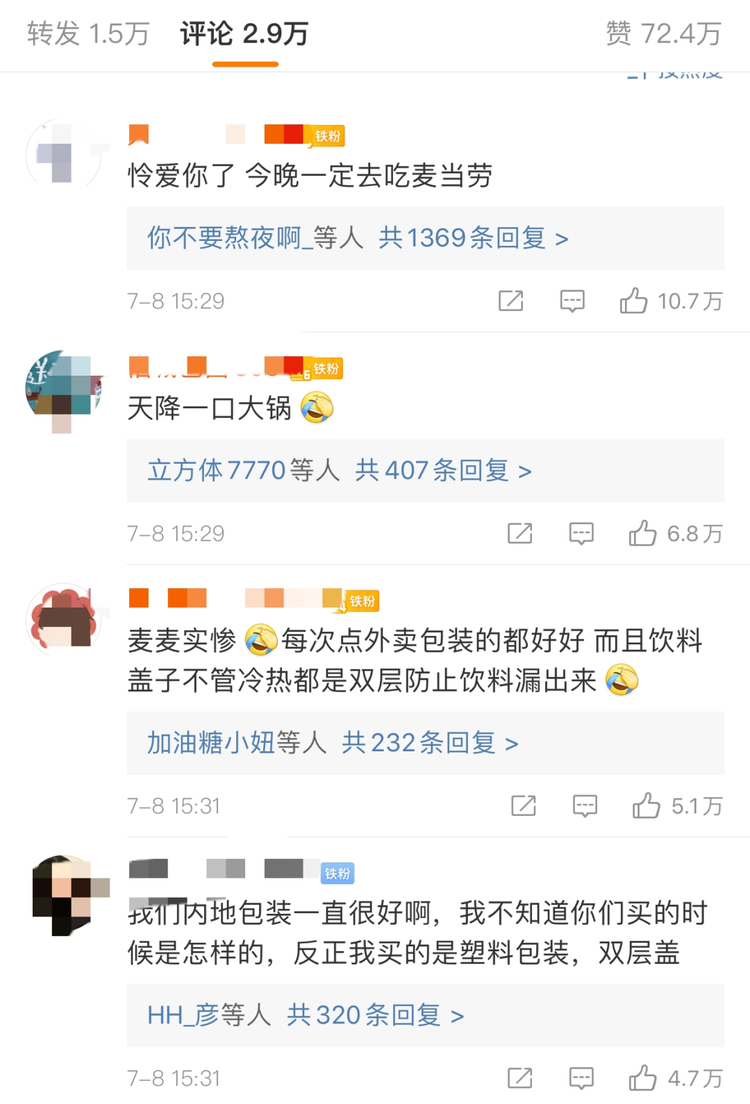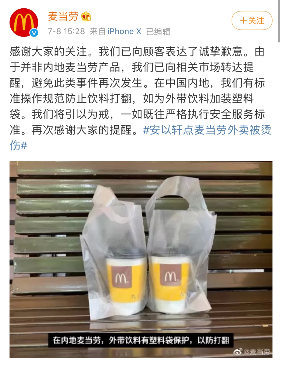 另一方面呢,麦当劳反应相当迅速,还明确表示了内地麦当劳,外带饮料是有塑料袋保护的,以防打翻。