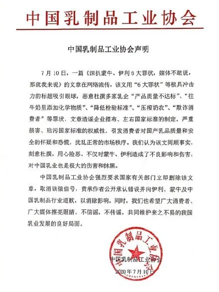 7月10日,中国乳制品工业协会针对网上《深扒蒙牛、伊利6大罪状,媒体不敢说,那就我来说》一文,发布声明进行回应,表示该文内容不实。