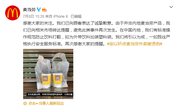 当天下午3点,麦当劳回应称:“感谢大家的关注。我们已向顾客表达了诚挚歉意。由于并非内地麦当劳产品,我们已向相关市场转达提醒,避免此类事件再次发生。在中国内地,我们有标准操作规范防止饮料打翻,如为外带饮料加装塑料袋。我们将引以为戒,一如既往严格执行安全服务标准。再次感谢大家的提醒。”