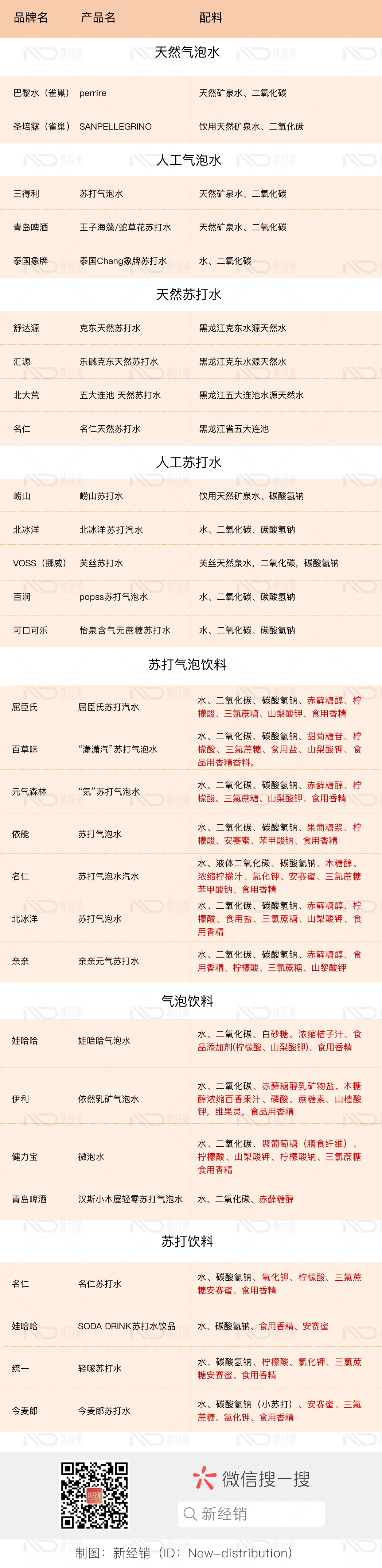然而,不可忽视的一个现象是,苏打水品类由于缺少统一的标准,显得略为杂乱。很多人难以区分苏打水、气泡水和碳酸水,目前大多数产品把三者混为一谈。新经销曾就此专门有一篇文章来科普区分办法,有兴趣的读者可以点击阅读《苏打水混战》(在下方呈现的图片,我们也在之前的产品基础上做了更新,可以查阅)。
