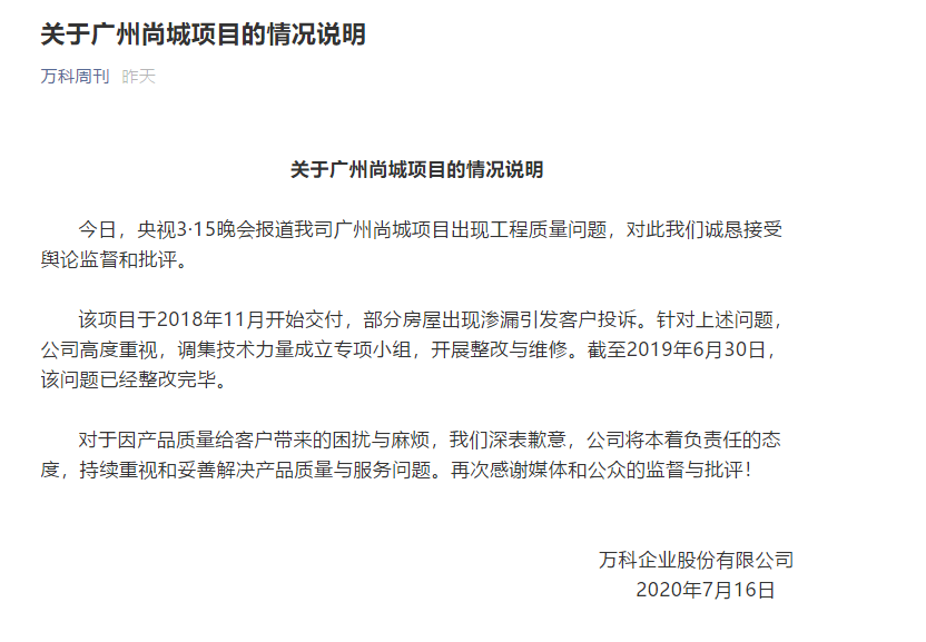 5.万科则在当天晚上11点31分通过中新网和自身微信公众平台“万科周刊”进行回应。