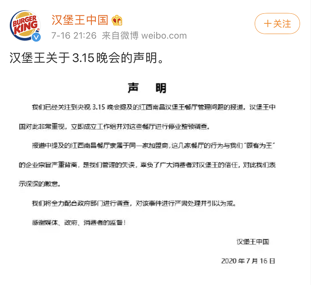随即发布微博官方声明:立即成立工作组对3.15晚会提及餐厅进行停业整顿调查