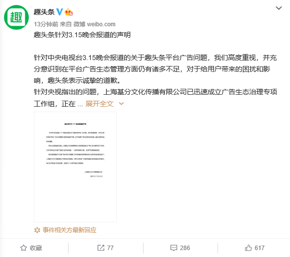 3. 趣头条发布微博官方声明:已成立专项工作组,对平台设计广告进行全平台彻查