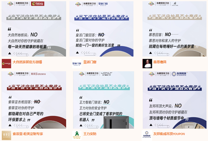 东鹏联动慕思、大自然、万和电器和索菲亚等家居品牌一起炒作#当下谈守护是否太奢侈#话题,针对话题创作关联品牌海报,并形成互动。此举引发整个家居圈热议,利用品牌掀起行业对“守护是否奢侈”的思考,引发行业关注和讨论,也带领行业人员对当今社会的人际关系产生深入的思考。