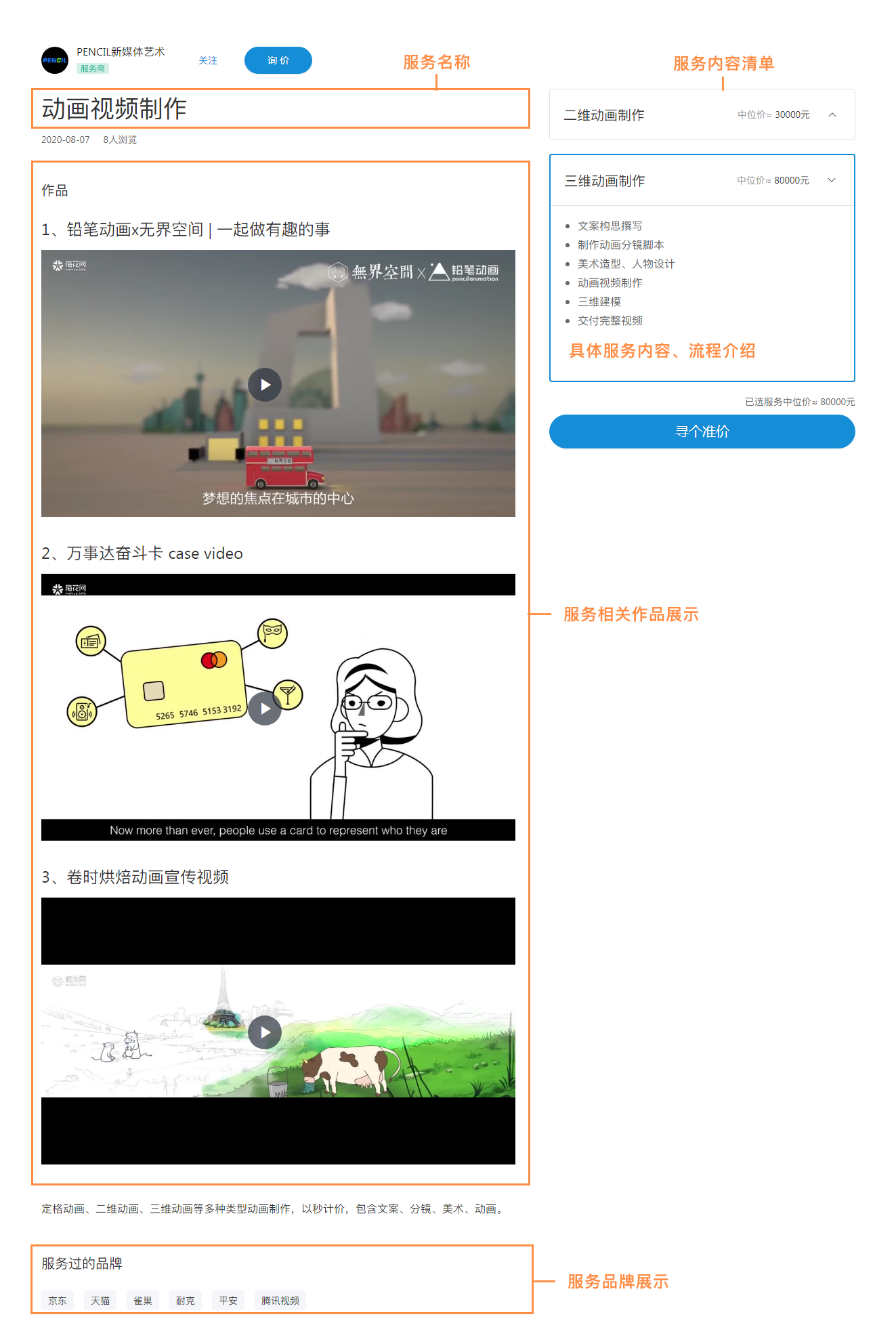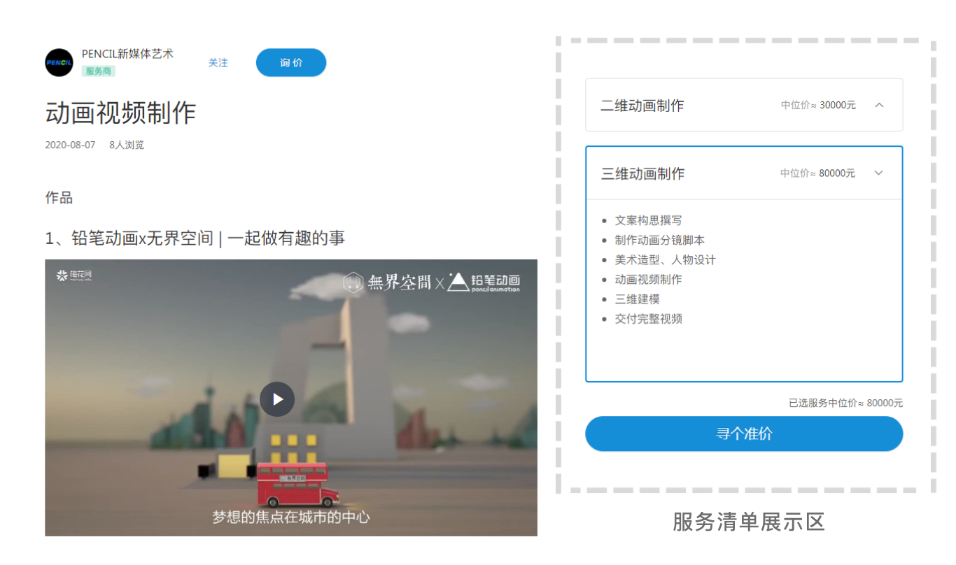 服务主要由三个部分组成:服务简介、服务清单、相关作品展示