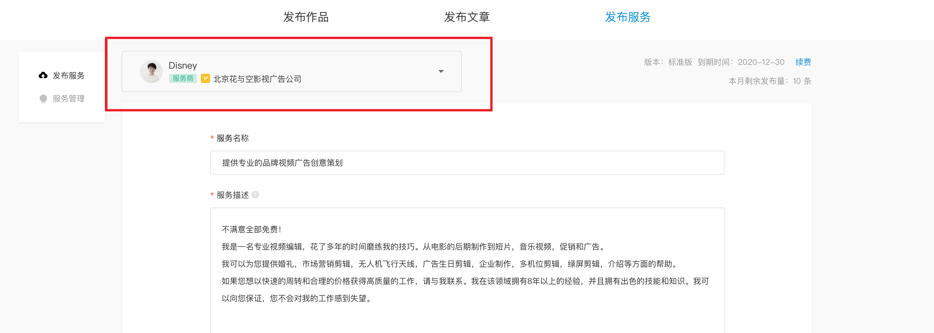 如果账号下有多个创作者,选择你要发布的服务所属的创作者