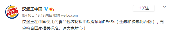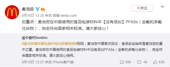 对此,8月10日中午,麦当劳官方微博回应此事:“划重点:麦当劳在中国使用的食品包装材料中【没有添加】PFASs(全氟和多氟化合物),完全符合国家相关标准。请大家放心!”