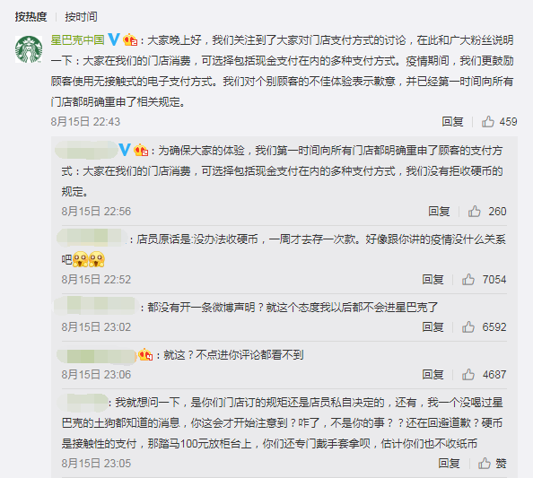 对此,星巴克中国官方微博在8月15日晚,在评论区回应称,在门店消费可选择包括现金支付在内的多种支付方式,没有拒收硬币的规定,疫情期间更鼓励顾客使用无接触式的电子支付方式,对个别顾客的不佳体验表示歉意,并已经第一时间向所有门店都明确重申了相关规定。