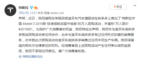 7月21日,连锁汽车销售平台宜买车在拼多多上推出了特斯拉Model 3的万人团购活动,团购价25.18万元,而同款车型官方指导价补贴后的售价则为27.155万元,团购价格比官方售价便宜了近2万元。与此同时,活动也惨遭特斯拉“打脸”,特斯拉火速发布声明称,并未与宜买车或拼多多就该团购活动有任何合作,也未与上述两方有任何形式的委托销售服务,亦未就此次团购活动向上述两方销售过任何本司生产车辆。针对特斯拉的声明,平台方拼多多也曾回应,车辆是正品,补贴也是真的。售卖车辆的商家客服也作出回复,称保证售卖车辆为正品。