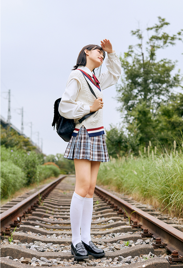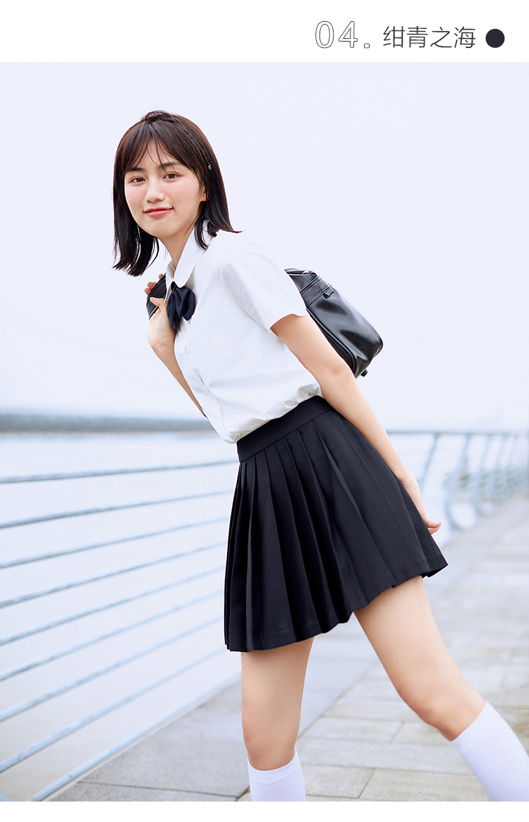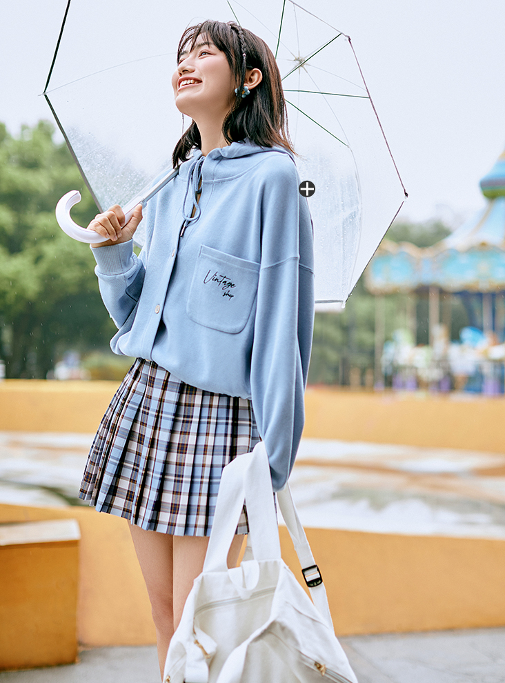 蓝灰格纹的色调,取蓝天与秋水。跟月见花开系列的少女感不同,星落秋屿系列则多了一份洋溢的少年感。