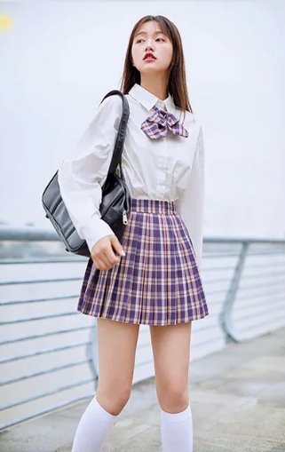 今年的夏天怎么能少了大热的流行色—紫色,跟白衬衫的搭配下,格纹裙又展现了温柔的一面。