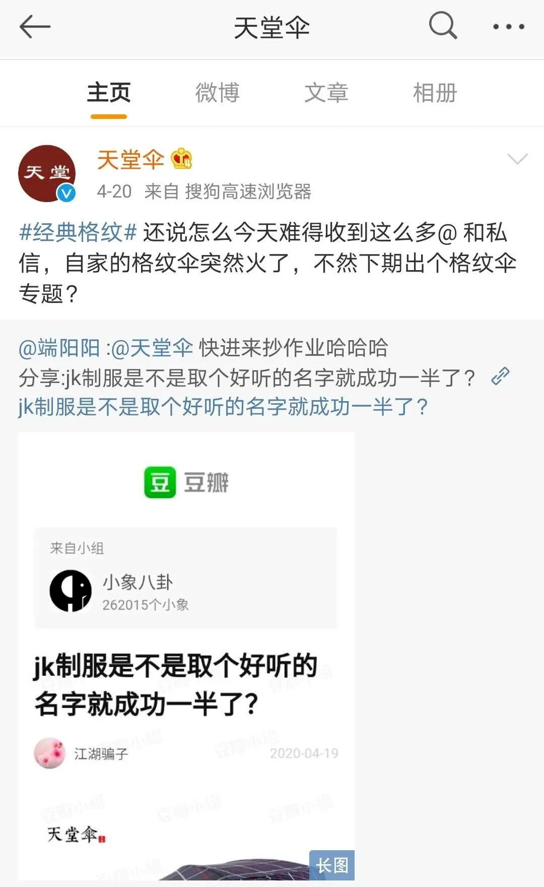 是的,天上不会掉馅饼,但真的会掉下网友的脑洞idea。而机智的品牌,则能顺势接住网友抛出的热梗。不知道最近有多少人因此而回购了一把天堂牌的格纹伞呢?