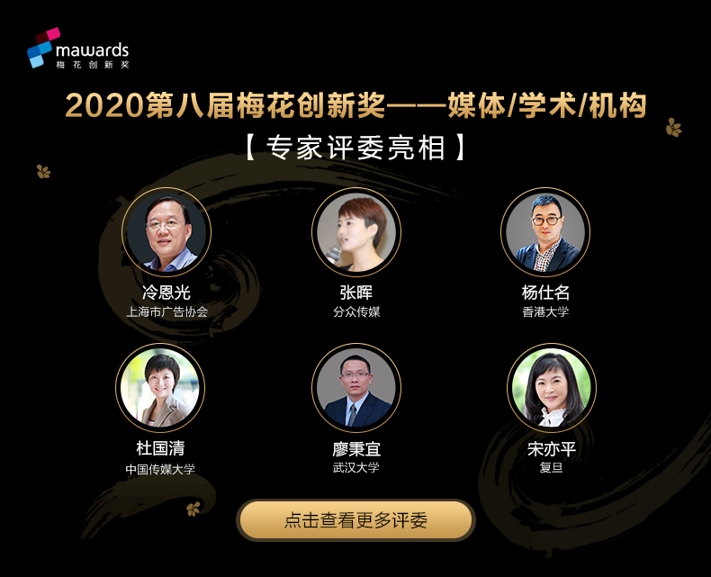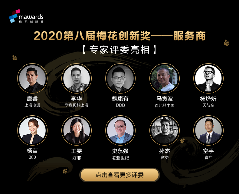 梅花创新奖是中国地区以“营销创新”为定位的奖项,旨在表彰每年在营销领域内创新实践的机构和作品。梅花网致力于将之打造为一项能够代表年度创新进程的标杆性奖项。围绕这一宗旨,在组建与大赛紧密相关的评委团时,格外注重能够代表营销领域内的创新力量,以此来打造一支全面覆盖营销行业的评委专家团。