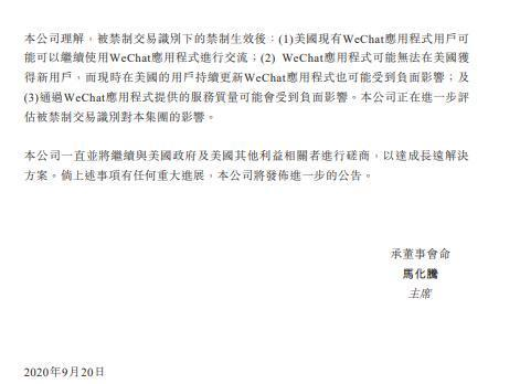 腾讯公司在声明中称,美国现有WeChat用户可能可以继续使用WeChat,但WeChat可能无法在美国获得新用户,WeChat提供的服务质量“可能会受到负面影响”。
