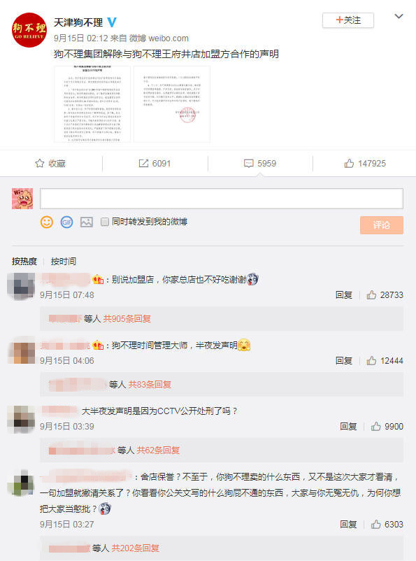 9月15日,狗不理集团股份有限公司官方微信发布《狗不理集团解除与狗不理王府井店加盟方合作的声明》。全文如下: