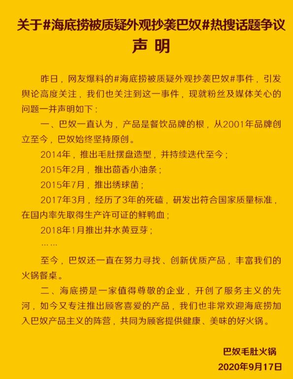 对此,巴奴毛肚火锅回应称,产品是餐饮品牌的根,从 2001 年创立至今,巴奴始终坚持原创。同时,巴奴表示,海底捞是一家值得尊敬的企业,开创了服务主义的先河,如今又专注推出顾客喜爱的产品,我们也非常欢迎海底捞加入巴奴产品主义的阵营,共同为顾客提供健康、美味的好火锅。