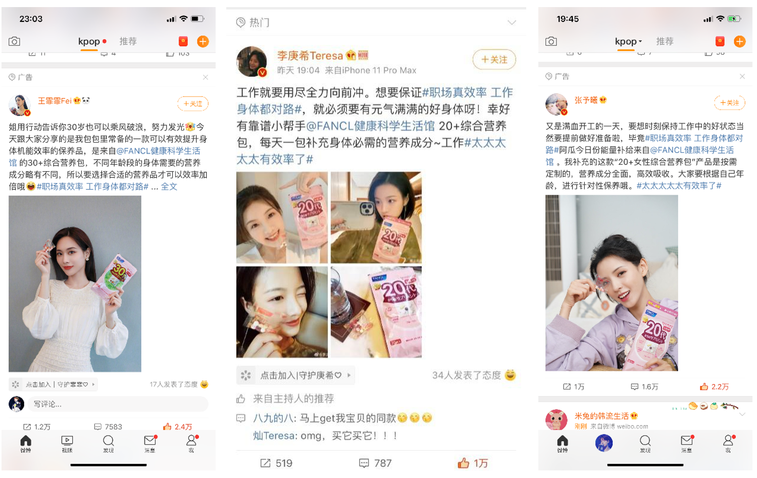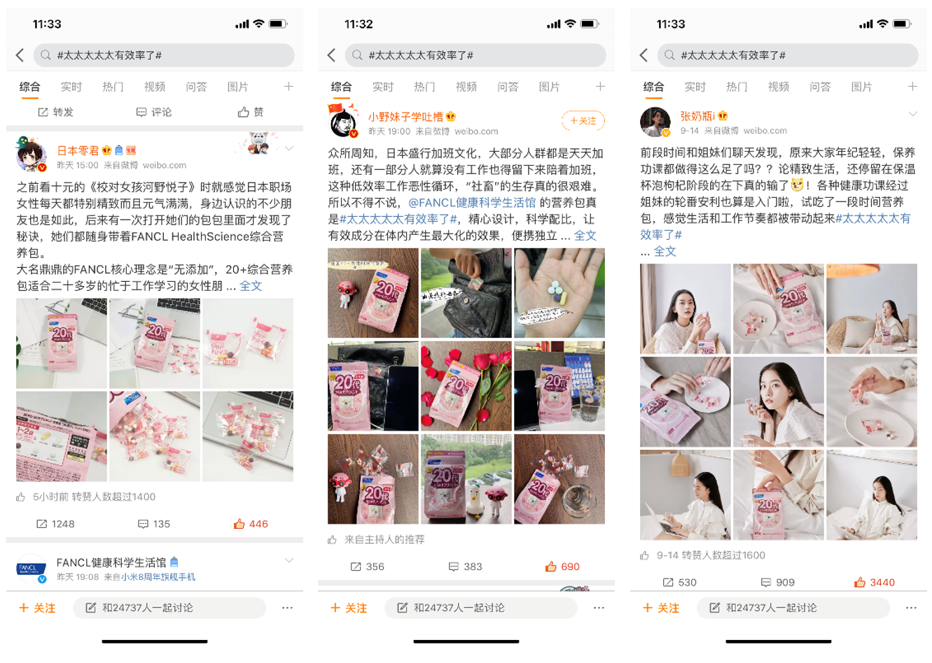 粉丝经济时代,明星大V不仅是消费者崇拜的心中偶像,为其推荐的产品买单更成为自身“忠诚度”的最大体现。FANCL选择@王霏霏Fei@李庚希Teresa@张予曦等不同年龄层的多位明星代表同步微博发声,整合站内外资源进行双向联动,玩转新式营销,为活动提高了声量,吸引大量粉丝参与话题互动。#职场真效率 工作身体都对路#话题一度登上微博热搜榜,引发网友热议。