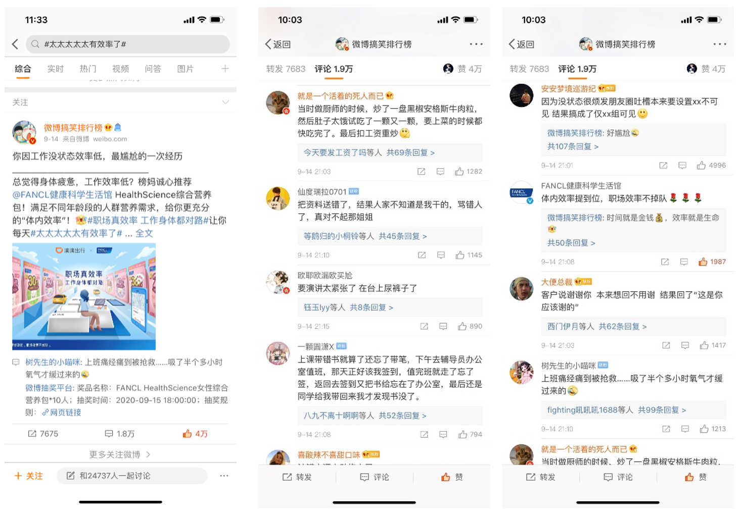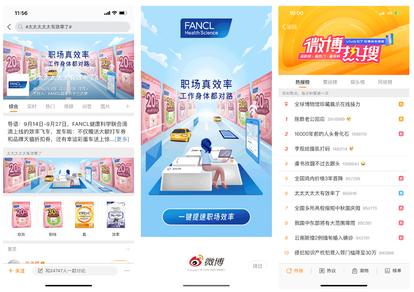除滴滴APP端内活动外,FANCL还联合微博搞笑排行榜,发起深戳职场人群“低效”痛点的互动话题,话题上线后迅速成为年轻上班族极高关注度与讨论互动的活动阵地,进一步实现与目标受众的深度沟通。