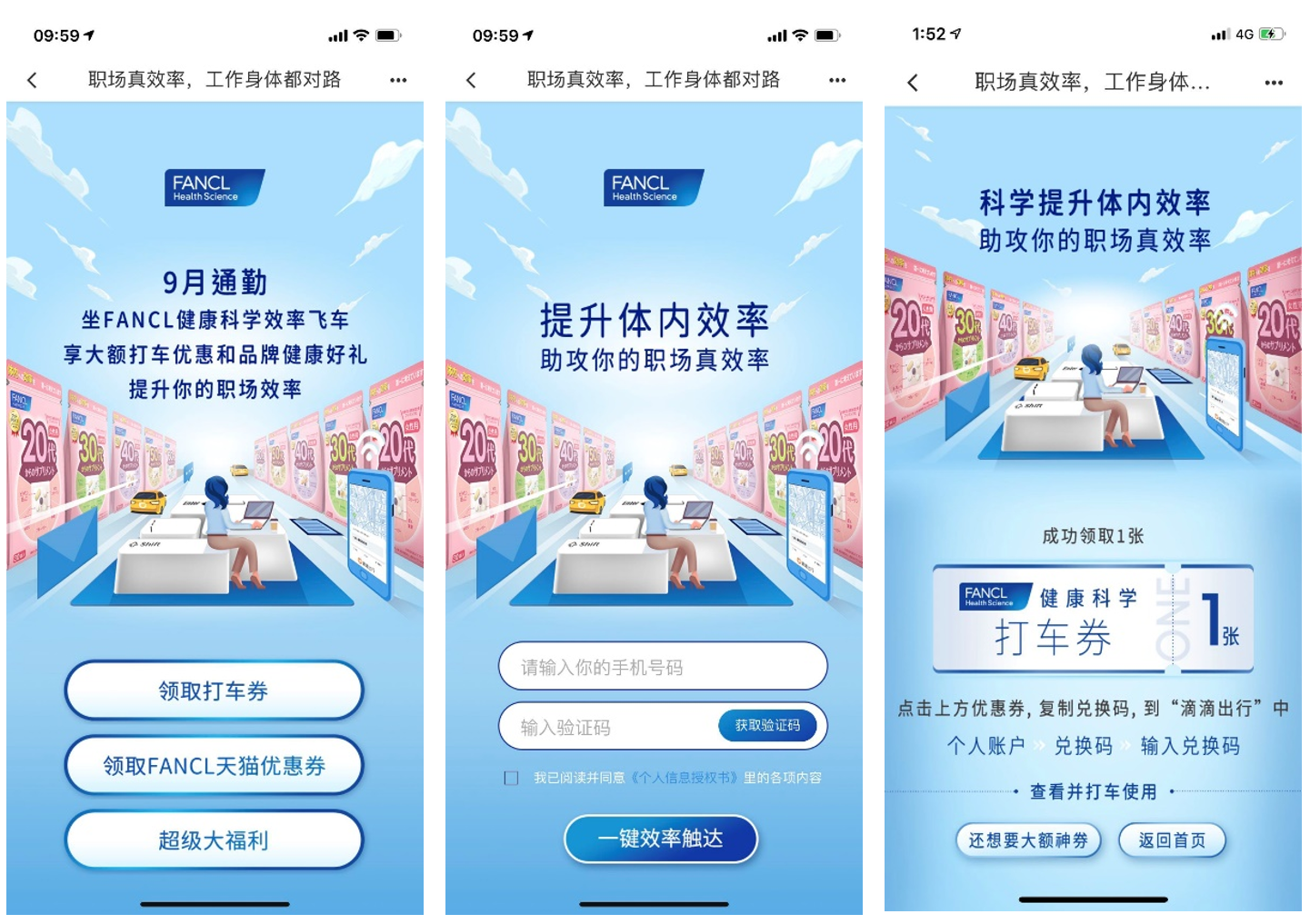 此次FANCL作为打入中国保养品市场首次营销亮相,选择与白领们常用的打车软件滴滴合作,进行跨界尝试,通过【职场真效率 让工作身体都对路】话题切入,深度链接职场人群,传递品牌核心竞争的“体内效率”卖点,不仅吸引了大批目标群体的关注和追捧,更在品牌曝光和流量营销上收获满满,打响了FANCL保健品品类知名度第一枪。