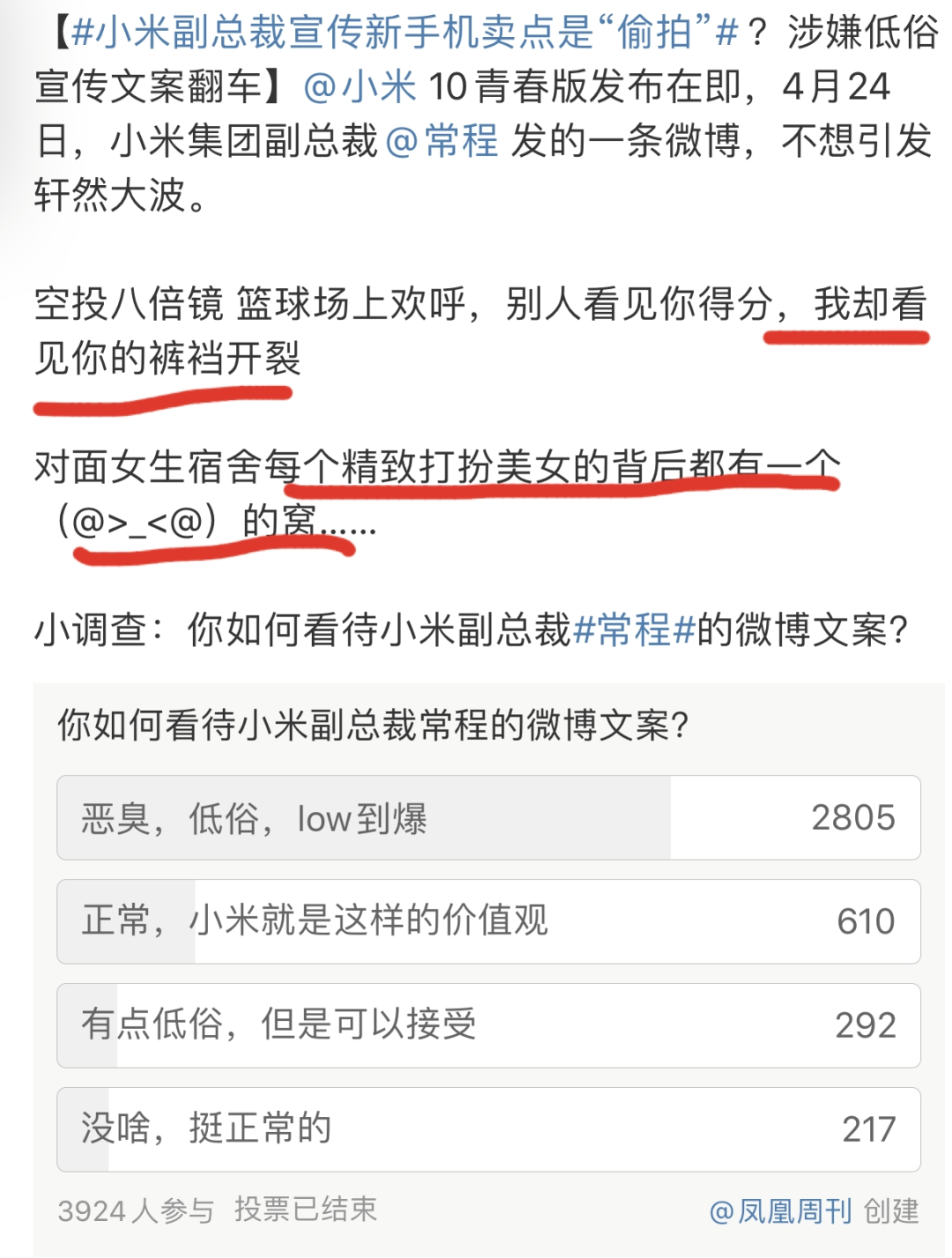 ,将手机卖点描述成看见女性的裤裆开裂,不少网友纷纷声讨小米低俗,low到爆。