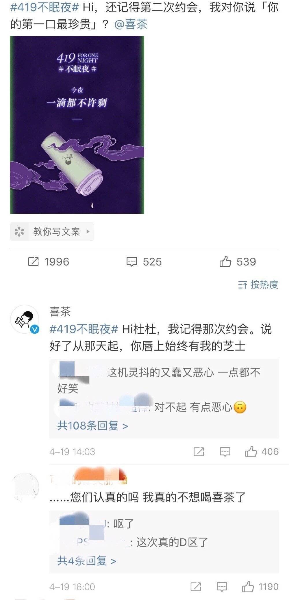 就比如营销老司机喜茶,非要和杜蕾斯联名,来了句: