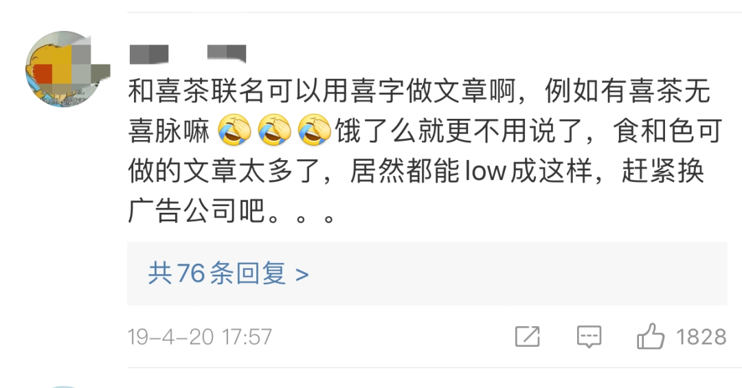 对于餐饮品牌来说,两性营销很难拿捏得当,就像刚提到的喜茶联名翻车,不少人都在吐槽喜茶的联名对象:餐饮类品牌与“性”产生联系,容易让人不适。