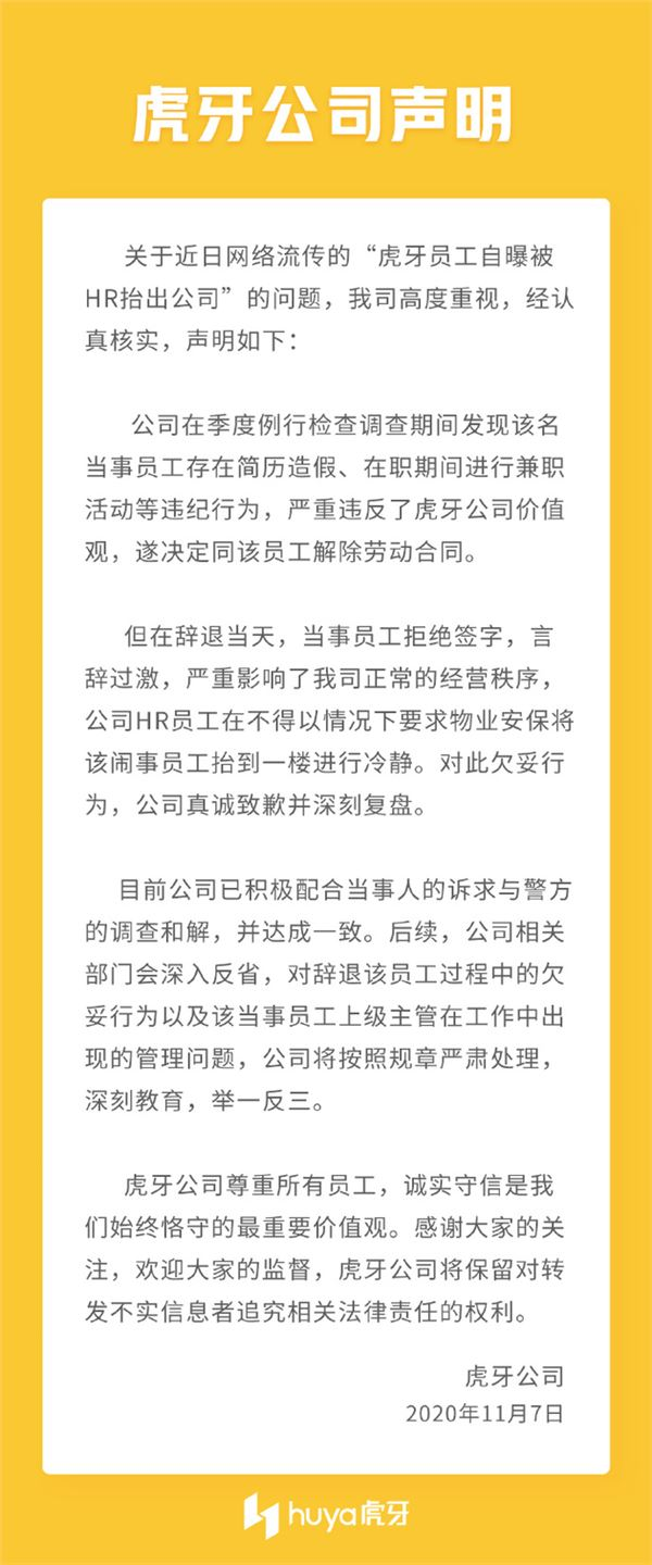 虎牙公司表示,对此欠妥行为,公司真诚致歉并深刻复盘。目前公司已积极配合当事人的诉求与警方的调查和解,并达成一致。后续,公司相关部门会深入反省,对辞退该员工过程中的欠妥行为以及该当事员工上级主管在工作中出 现的管理问题,公司将按照规章严肃处理,深刻教育,举一反三。
