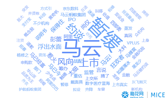 梅花网MICE以“蚂蚁集团、蚂蚁金服”为关键词,监测了11月2日-8日的舆情数据,热词云图如下图所示,“马云”、“暂缓”、“上市”和“约谈”成为最热关键词。