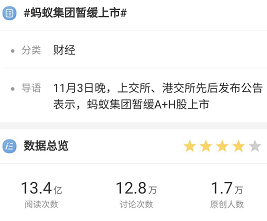截至到11月9日中午,#蚂蚁集团暂缓上市#的热搜拥有13.4亿次阅读数,讨论次数12.8万,原创人数1.7万。