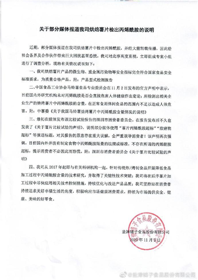 11月3日上午,针对烘焙薯片中检出丙烯酰胺一事,盐津铺子在其官方微博给予回应。