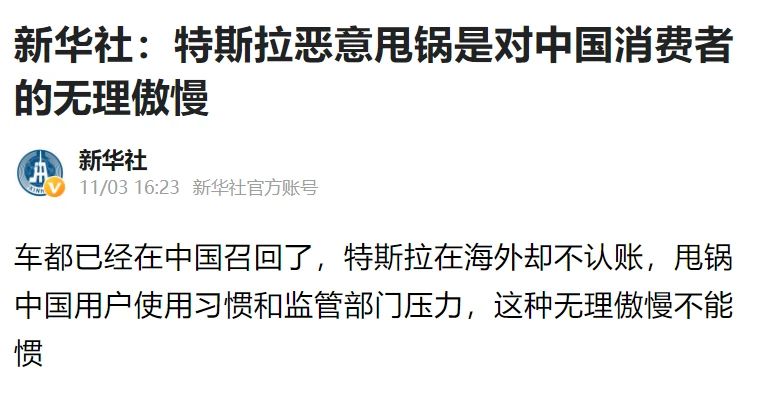 11月3日,新华社发布了一篇标题为《特斯拉恶意甩锅是对中国消费者的无理傲慢》的评论,点名批评特斯拉:在中国召回产品后,在美国却不认账,无理傲慢地“甩锅”给中国用户使用习惯和监管部门压力。