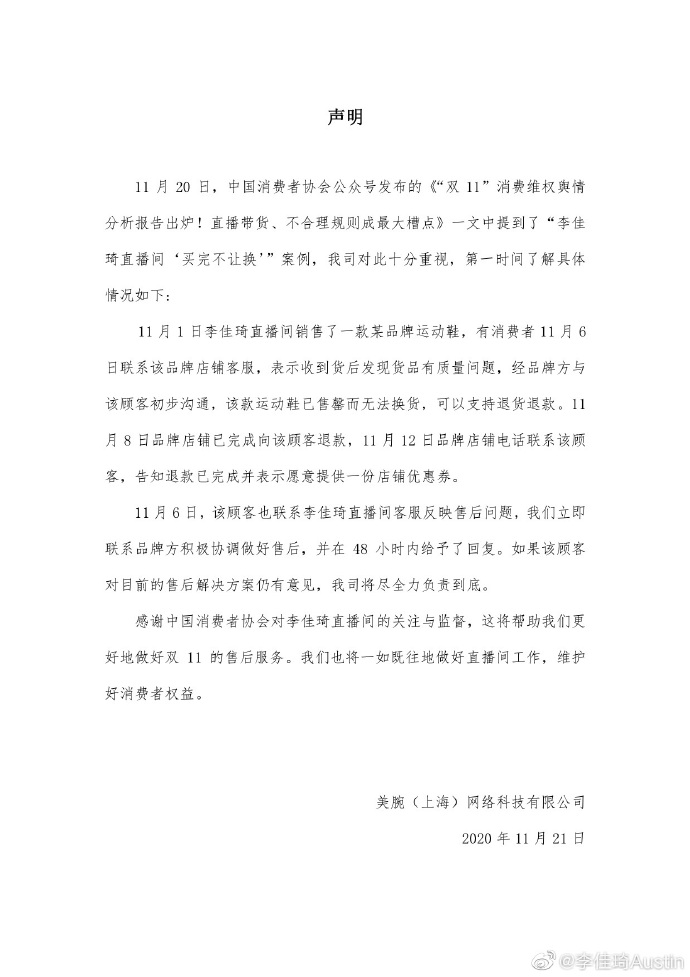 对此,李佳琦、李雪琴作出了回应。11月21日晚,李佳琦在其微博发表声明:“佳琦直播间一向重视售后服务。经了解,品牌方已与该顾客初步沟通,因该款运动鞋售罄而无法换货,支持退货退款,并于11月8日完成向该顾客退款。此前,佳琦直播间客服也立即联系品牌方积极协调做好售后,并在48小时内给予了回复。佳琦欢迎社会各界的监督,我们将一如既往地做好直播间工作,维护好消费者权益。”