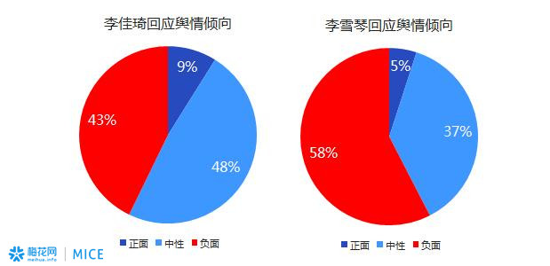 梅花网MICE舆情监测以从11月20日至今天中午为时间范围,分别以“李佳琦”和“李雪琴”为标题关键字,监测的舆情倾向如下图所示。李佳琦负面占比43%,小于李雪琴58%,而正面占比9%也高于李雪琴5%。