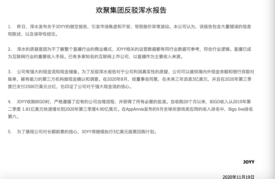 11月19日晚间,欢聚集团进一步在其官网对此事作出回应。欢聚集团认为,浑水的质疑是因为不了解整个直播行业的商业模式,欢聚集团相关的运营数据都有同行业数据可参考,符合行业逻辑。直播已成为互联网行业的重要收入手段。已有多家知名的互联网上市公司,以直播作为主要收入来源。此外,公司有强大的现金流和现金储备。为了反驳浑水报告对于公司利润真实性的质疑,公司可以提供海内外现金余额和银行存款对账单,被有能力的第三方机构做现金确认和调查。关于海外业务BIGO,欢聚集团称, 欢聚集团收购BIGO时,严格遵循了应有的公司治理流程,并获得了所有必要的批准。为了展现公司对长期前景的信心,欢聚集团将继续执行3亿美元股票回购计划。