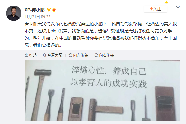 11月21日,小鹏汽车CEO何小鹏在微博发文称“看来昨天我们发布的包含激光雷达的小鹏下一代自动驾驶架构,让西边的某人很不爽,连续用pigu发声。我想说的是,造谣早就证明是无法打败任何竞争对手的。明年开始,在中国的自动驾驶你要有思想准备被我们打得找不着东,至于国际,我们会相遇的。 ”而这条微博的配图则写有“淬炼心性、养成自己”的文字。