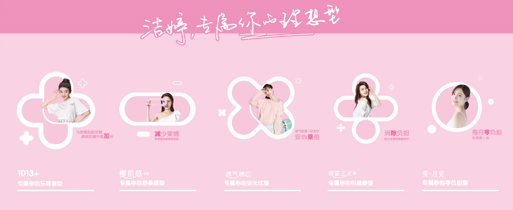 像“+”代表为青春期女孩打造的「1013+系列」;“÷”代笔为健康养生党消“÷”(除)负担的「棉氧主义系列」;针对活力自在女生打造了安无忧型「透气棉系列」,实现透气防漏一步到位,安心“×”(乘)倍;呵护价格敏感性女生则有「美月见系列」,希望她们每月“0”负担,生活美一点。