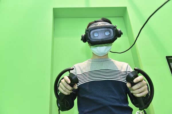 体验区内是两个L型活动区,体验基于HTC Vive Cosmos的PC VR系统(结合Index五指追踪手柄),两组玩家可同时体验。体验区外布置了拍照互动墙、轻量VR体验(基于VR一体机平台)为等候区的客人提供了更多元化选择。