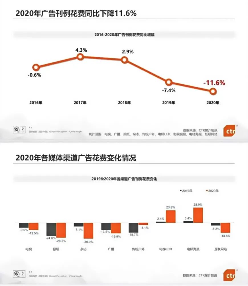 根据CTR年初发布的报告《2020年中国广告市场年度盘点》,2020年广告刊例花费同比下降11.6%。受疫情影响,这是近五年来下降最大的一年。