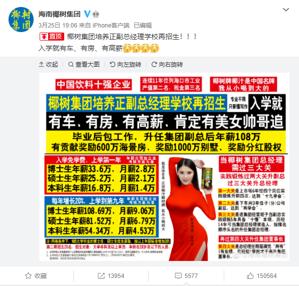 近日,椰树集团在官方微博发布了一则“招生广告”,再看文案,相关字眼非常抢眼,“椰树集团培养正副总经理学校再招生,专业不限,只要懂写作,入学就有车、有房、有高薪,肯
