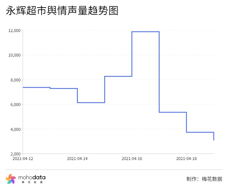 梅花数据以“永辉超市”为关键词,监测得出舆情声量趋势图如下图所示,4月16日公司发表致歉回应声量最高,之后声量迅速下滑。