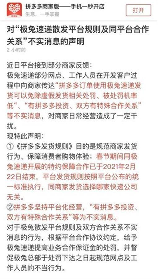 4月12日,拼多多通过商家版App发布声明,澄清与极兔速递无特殊合作、无投资关系。