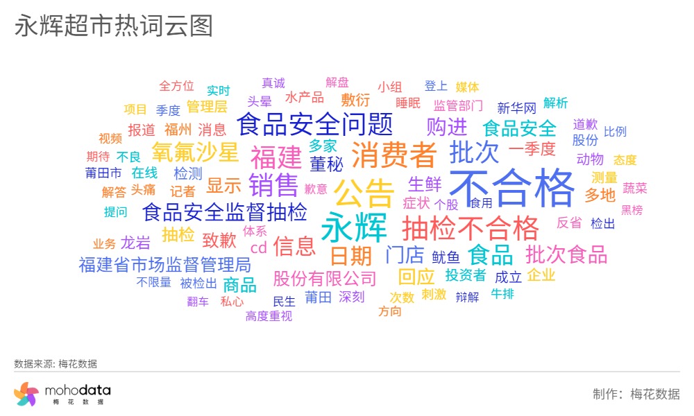 梅花数据以“永辉超市”为关键词,时间范围为4月12日-18日,获得永辉超市热词云图如下所示。其中“不合格”、“抽检”、“食品安全问题”、“氧氟沙星”、“致歉”等敏感词汇排名前列。