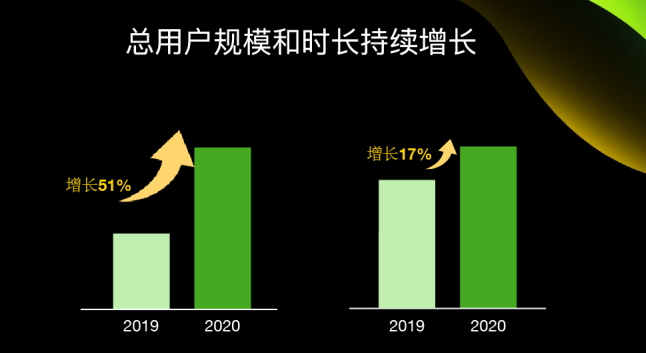 尤其是在过去一年的时间里面,快手8.0的上线实现了单列和双列、公域和私域高效的融合,使快手平台的内容厚度和丰富度有了大幅度提升,也驱动了快手平台的用户规模、用户时长获得了大幅度提升,快手APP的年均DAU增长超过了50%,人均时长增长超过了17%,包含小程序在内,快手的日活用户已经超过了3亿。