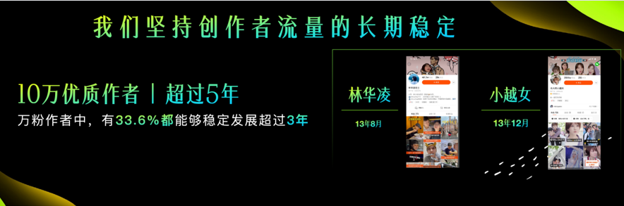 通过严强的分享,我们还能发现万粉以上的快手创作者中,有超过一半的用户获得了实际的收益,远高于行业平均水平;超过33%的万粉(以上)创作者,可以稳定发展超过三年;能坚持在快手平台稳定生产和创作超过五年的优质创作者,目前已突破了10万人。