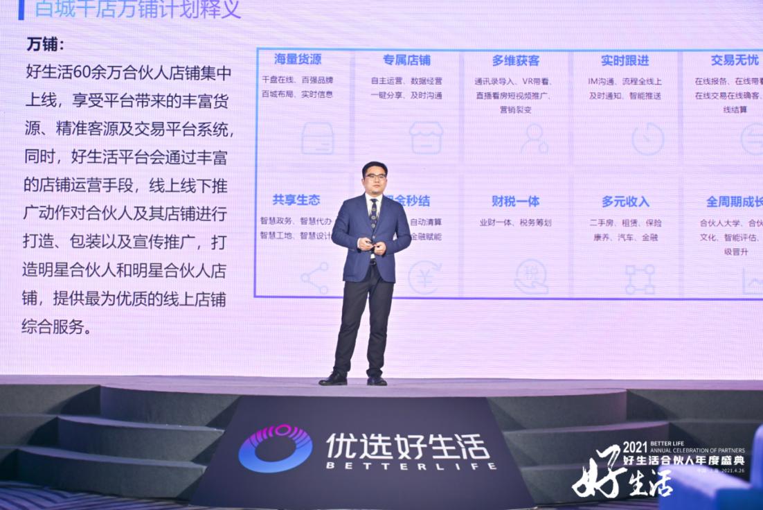 在“百城千店万铺”计划中,“百城”聚焦的是全国5大重点经济区域100座以上城市的高势能家庭资产配置需求;“千店”则是聚合优质合作伙伴,打造线上品牌企业旗舰店,为优质企业提供最佳展示平台,提供优质且丰富的货源支持;“万铺”瞄定的是好生活60万“云上合伙人”,为其提供全方位的运营支持和优质的线上店铺综合服务。