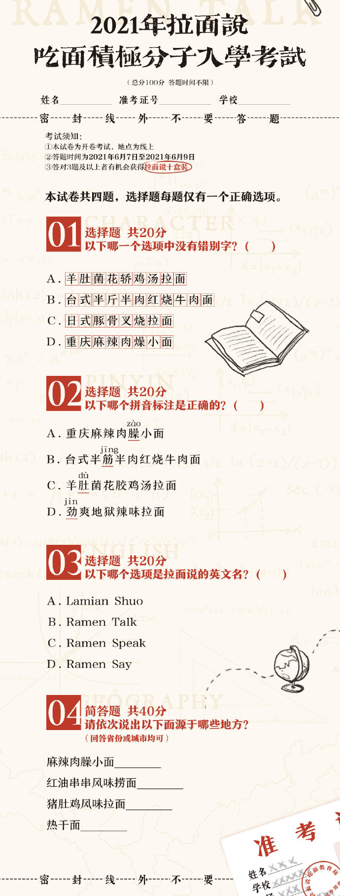 答对三题以上(含三题)抽 3 位送三盒装拉面说,抽 1 位送十盒装拉面说